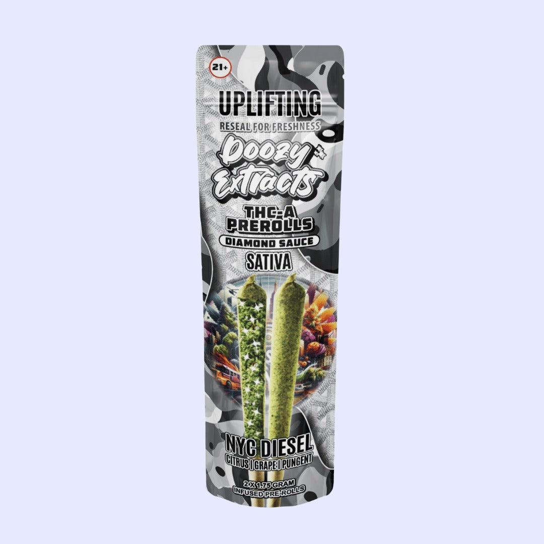 Ignite your senses with Doozy Extracts' 3.5G THCA Diamond Sauce Prerolls in NYC Diesel flavor. Crafted with precision, these prerolls blend premium THCA diamonds with the vibrant NYC Diesel flower, offering a stimulating and energizing smoking experience. Enjoy the citrusy, diesel-like aroma with each exhale, accompanied by a potent and uplifting high that's perfect for enhancing focus and creativity. Elevate your cannabis enjoyment with our NYC Diesel prerolls today.