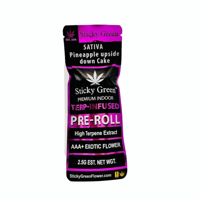Experience the essence of terpene-rich cannabis with Sticky Green 2.5g High Terpene Extract Terp Infused 2ct Pre Roll. Each pre-roll is carefully crafted with premium flower infused with a flavorful blend of terpenes to enhance your smoking experience.