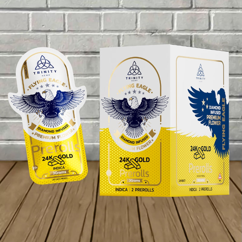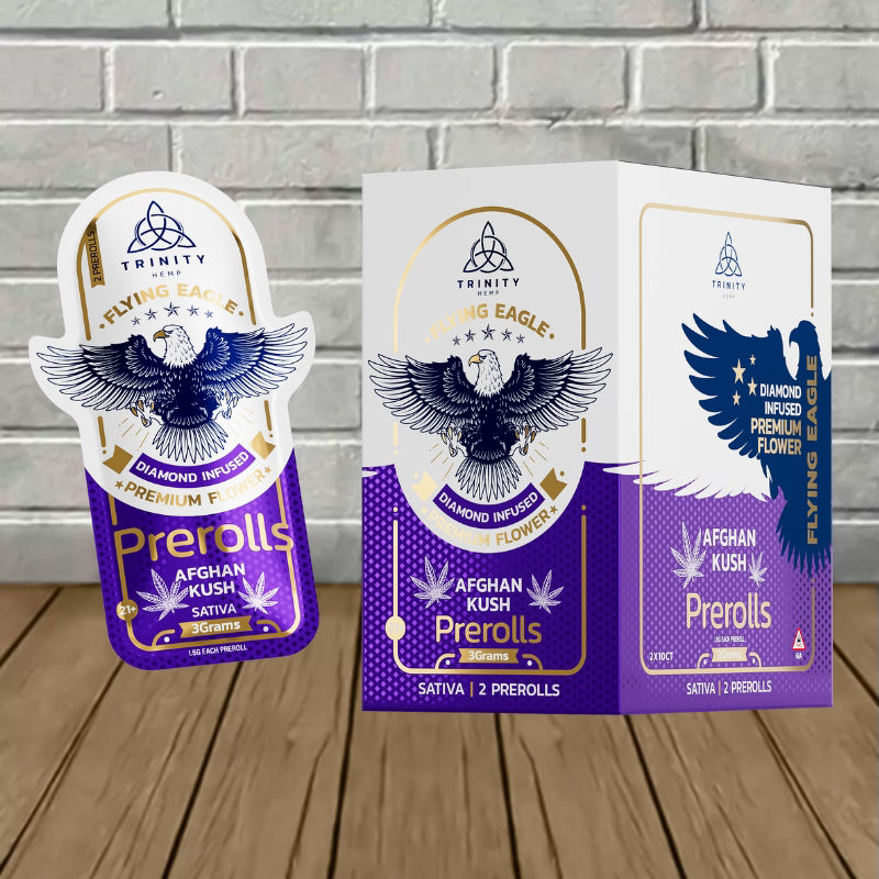 The Trinity Flying Eagle THCa prerolls 3g bring premium quality and powerful effects in every pack. Each set includes two 1.5g prerolls made with top-shelf hemp flower and infused with THCa diamonds for stronger potency and a smooth burn. Choose from strain options like Blue Dream, Kush Breath, and Alaskan Thunder to match your mood. Perfect for both seasoned smokers and curious newcomers, these prerolls deliver bold flavor, clean effects, and the convenience of a ready-to-use smoke.