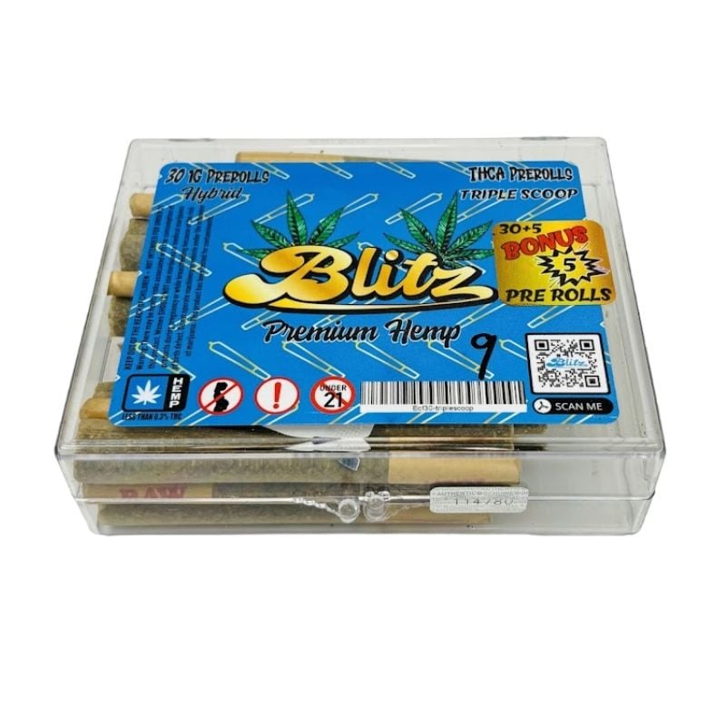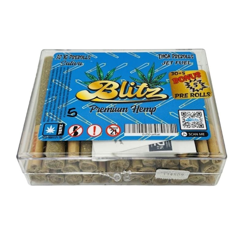 Blitz THC-A Pre Rolls offer a premium smoking experience with 1 gram per roll. Each pack contains 30 pre-rolls plus 5 extra pieces, providing exceptional value and convenience.