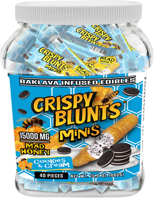 Indulge in the irresistible taste of Crispy Blunts Minis, packed with the perfect blend of baklava and Mad Honey. Each mini treat is infused with 15,000 mg of potent Mad Honey and features a delicious Cookies & Cream flavor. With 40 pieces per jar, these edibles provide a sweet and satisfying experience. Ideal for those who crave a unique, high-potency snack.