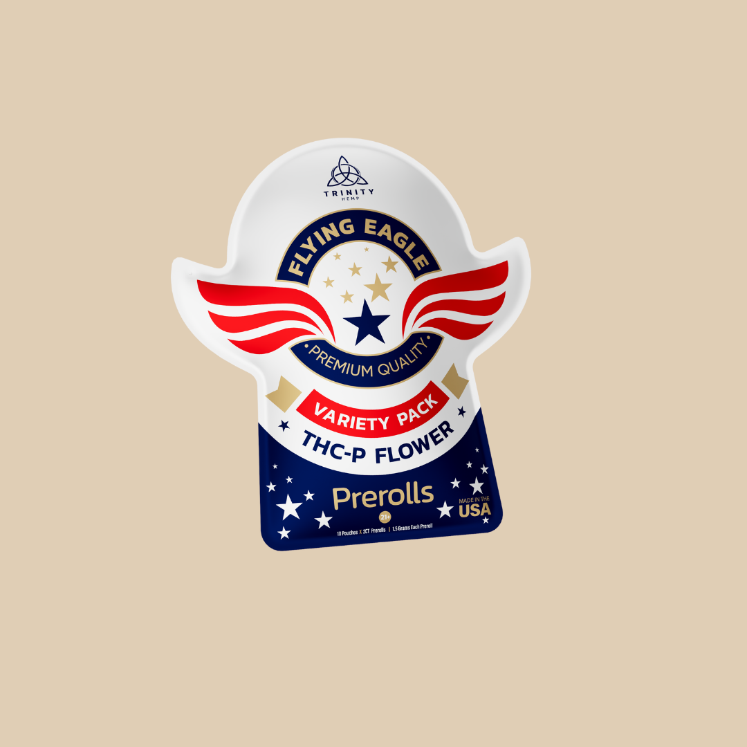 The Trinity Flying Eagle THC-P pre-rolls 3g deliver next-level potency and an elevated experience in every pack. Each set includes two 1.5g pre-rolls crafted with premium hemp flower and infused with THC-P for effects that feel noticeably stronger and longer-lasting than traditional cannabinoids. Choose from strain options like Frozen Margarita, Tropical Twist, and Afghan Kush to dial in your vibe. Ideal for experienced users looking for a more intense ride - and adventurous newcomers ready to level up - these pre-rolls offer bold flavor, a smooth burn, and powerful, head-to-toe effects in a ready-to-smoke format.